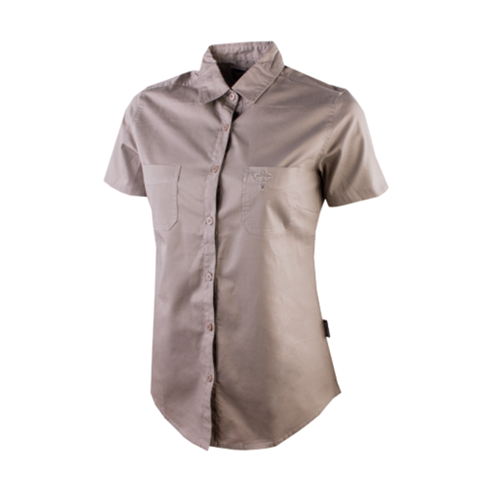 This ladies shirt is made of a lightweight 100% cotton material and has two pockets on both sides of the chest. It is a simple button-up shirt with a collar. The pockets have no buttons or flap closures. It has a curved bottom, it is not straight so it is ideal for tucking in and covering a part of your backside. The shirt has a Wildebees logo design embroidery label on the pocket and some branding tags on the side. The back of the shirt is plain.
